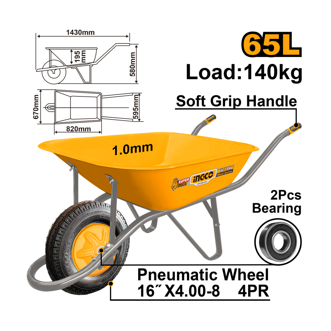 CARRINHO DE MAO 65L PNEU C/CAMERA CAPAC 140KG CHAPA 1,00MM INGCO HHWB4010P
