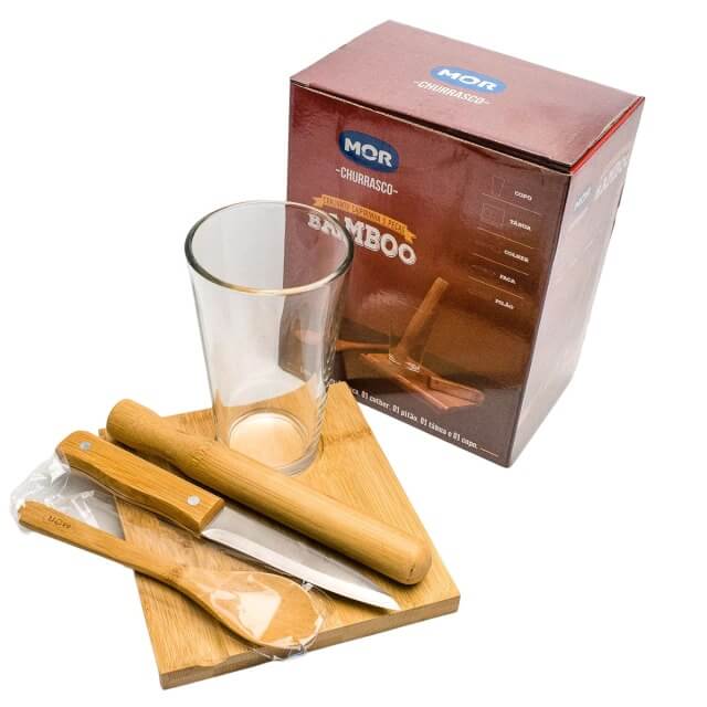 Um presente certeiro para quem adora assar um churrasco degustando um bom aperitivo, o Conjunto Caipirinha 5 Peças Bamboo vai agradar em cheio! Perfeito pra acompanhar os almoços do fim de semana, esse conjunto vem completo com copo de vidro de 500ml, tábua, pilão, colher de bamboo, faca com cabo em bamboo e lâmina em aço inoxidável. Além de proporcionar um design rústico, o bamboo tem ação bactericida natural e como suas fibras não apresentam poros, não há acúmulo de resíduos. Ou seja, além de peças bonitas, são muito higiênicas!
